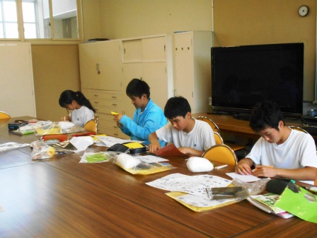 宮ヶ瀬合同体育祭に向けて、何年ぶりかで団旗を新調します!3年生がデザインした紅白の旗を彩色していきます。 |