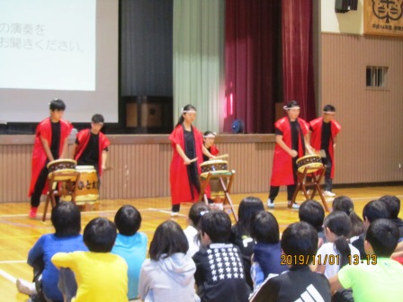 今回のEJタイムは、和太鼓体験でした。高学年には中学生が曲を伝え、低・中学年には教員がリズム打ちを教えました。次回が楽しみです。 |