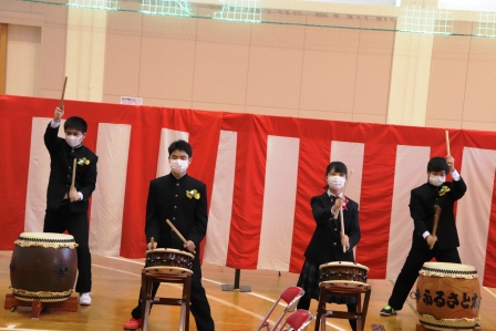 例年とは違った卒業式になりました。しかし、最後に4人一緒に和太鼓を演奏し、立派に決意表明をして巣立ちました。おめでとう! |